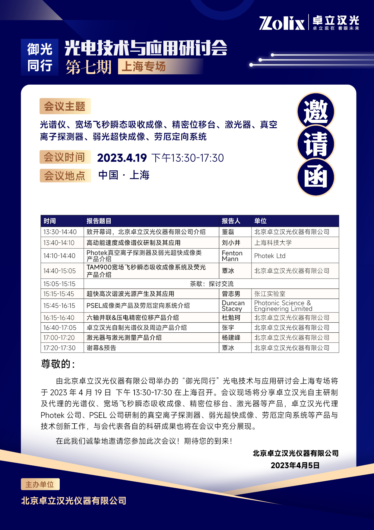 截至目前,卓立漢光已順利舉辦了五期線下/線上研討會(huì),觀眾熱情高漲,為了滿足大家對(duì)會(huì)議的期待,接下來的三期“御光同行”主題研討會(huì)將分別在北京、上海、合肥舉辦,誠(chéng)邀會(huì)議所在城市及周邊單位的專家學(xué)者參加會(huì)議。