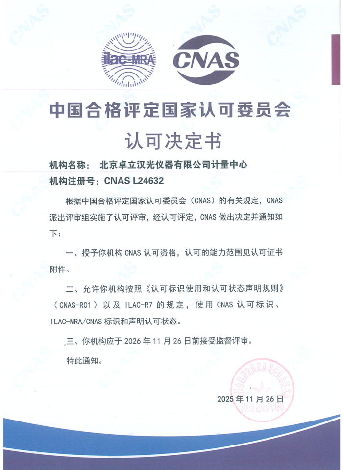 此次 CNAS 認(rèn)可,是對(duì)北京卓立漢光儀器有限公司計(jì)量中心技術(shù)實(shí)力與服務(wù)品質(zhì)的權(quán)威肯定,更是未來(lái)持續(xù)精進(jìn)的新起點(diǎn)。我們將始終秉持“精準(zhǔn)計(jì)量、服務(wù)產(chǎn)業(yè)”的使命,不斷優(yōu)化技術(shù)能力、提升服務(wù)水平,以更權(quán)威的資質(zhì)、更精準(zhǔn)的結(jié)果、更專業(yè)的服務(wù),為廣大客戶筑牢質(zhì)量基石,賦能產(chǎn)業(yè)高質(zhì)量發(fā)展,助力科研創(chuàng)新與市場(chǎng)競(jìng)爭(zhēng)提供堅(jiān)實(shí)的計(jì)量支撐!