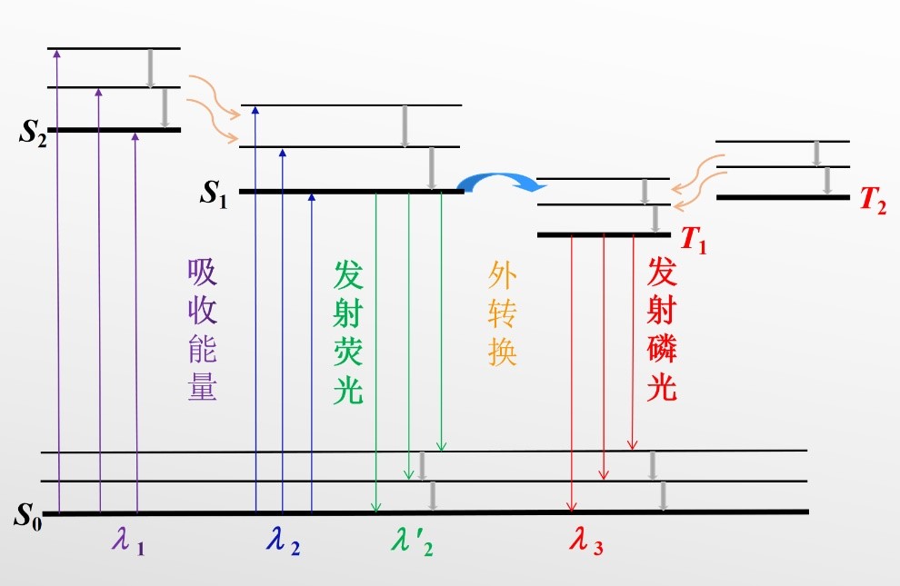 其本質(zhì)是物質(zhì)分子吸收了激發(fā)光的能量,短波長的激發(fā)光使其周圍的電子由基態(tài)躍遷到能量更高的第一激發(fā)態(tài),或是第二激發(fā)態(tài)。在激發(fā)態(tài)的電子非常不穩(wěn)定,它們會以多種不同的形式釋放能量,從而回到基態(tài),這是一個很復(fù)雜的過程。
