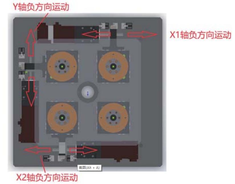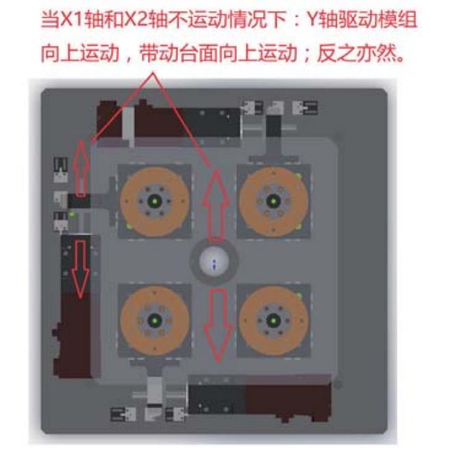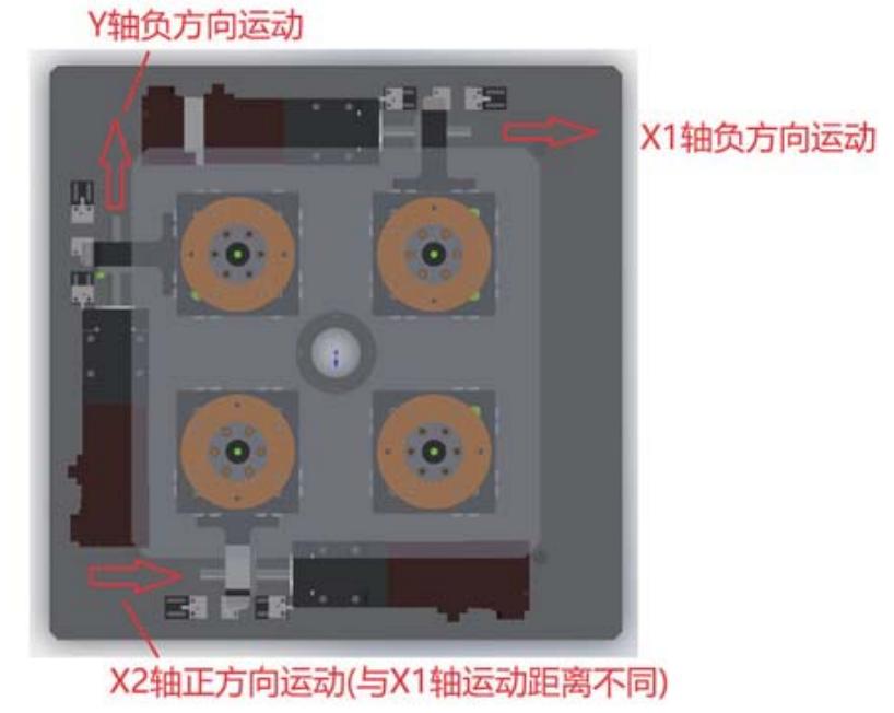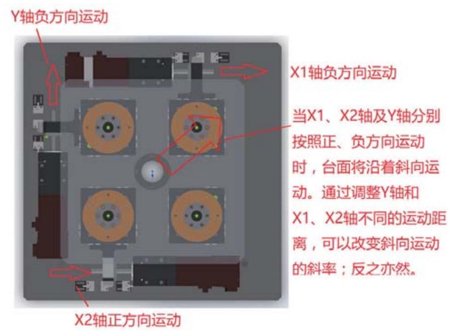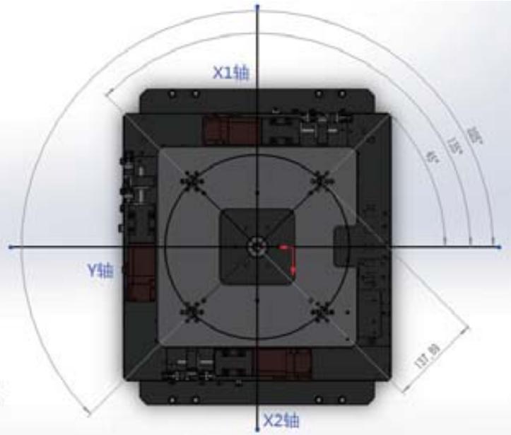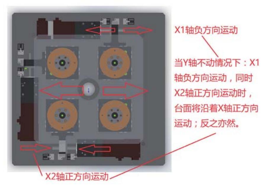 X方向運(yùn)動(dòng):Y軸模組不運(yùn)動(dòng),X1和X2軸模組同時(shí)運(yùn)動(dòng)(運(yùn)動(dòng)距離相同但模組運(yùn)動(dòng)方向相反),臺(tái)面便沿著X方向進(jìn)行平移運(yùn)動(dòng)。由上分析我們可以清晰地看出,平移運(yùn)動(dòng)非常簡(jiǎn)單,只需要輸入對(duì)應(yīng)的運(yùn)動(dòng)距離即可,而旋轉(zhuǎn)運(yùn)動(dòng)則需要我們使用算法計(jì)算出對(duì)應(yīng)的數(shù)值。接下來(lái),我們著重講解如何進(jìn)行算法運(yùn)算。