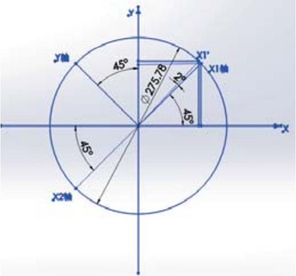 相當(dāng)于X1軸往坐標(biāo)系X軸的負(fù)方向運(yùn)動(dòng),因此得到的應(yīng)該是一個(gè)負(fù)值。通過(guò)幾何分析可知,絲杠移動(dòng)的距離為X1’點(diǎn)的橫坐標(biāo)減去X1點(diǎn)的橫坐標(biāo):