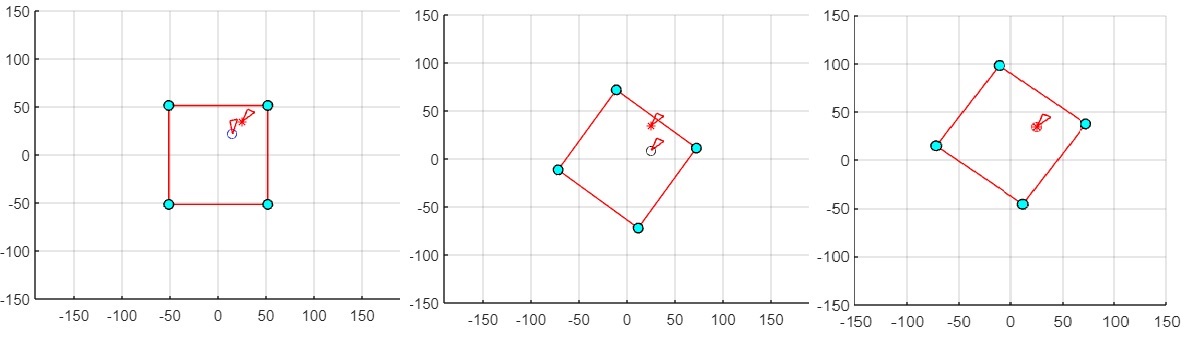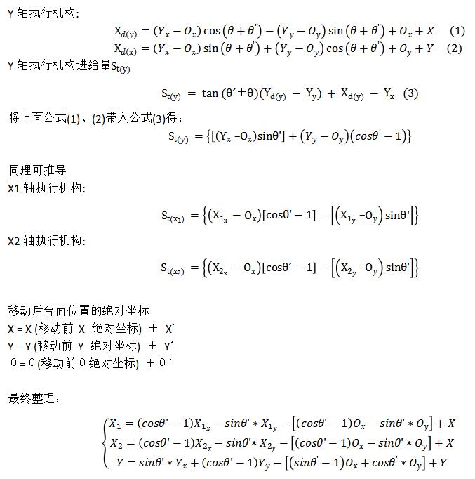 接下來我們再進(jìn)階一下,算一下以對位平臺臺面上任意一點(diǎn)為中心,進(jìn)行旋轉(zhuǎn)運(yùn)動的運(yùn)動學(xué)方程正反解