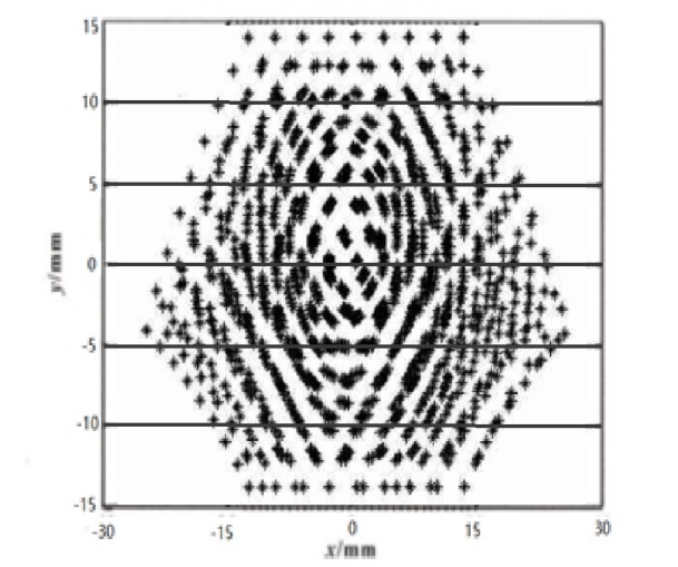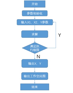 對于工作空間的求解一般采用解析法或數(shù)值法,解析法從工程角度而言十分繁瑣,直觀性不強(qiáng);數(shù)值法利用位置正解或逆解來求解工作空間。我們通過MATLAB軟件求解機(jī)構(gòu)的位置正解及電機(jī)和導(dǎo)軌行程作為限制條件進(jìn)行工作空間的求解。