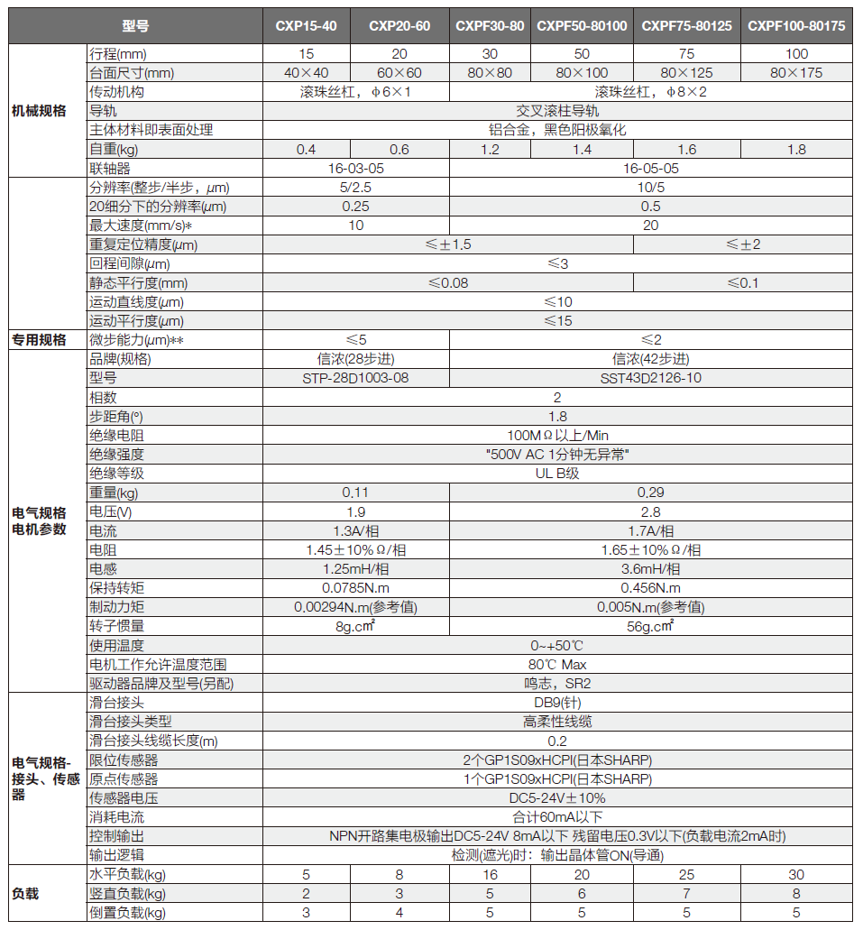 CXP 系列產(chǎn)品是卓立漢光為解決小尺寸、高使用頻率等情況專門設計的高精密電動直線滑臺。該系列產(chǎn)品主體材料采用硬質(zhì)鋁合金,表面黑色陽極氧化處理,耐磨性好、外型美觀。產(chǎn)品采用交叉滾柱導軌,強度高、負載能力強、耐用性好,配合導軌面精密磨削技術(shù),使該系列產(chǎn)品具有較高的運動精度。驅(qū)動機構(gòu)采用進口滾珠絲杠(1mm 導程),標配二相步進電機(日本品牌),可提供較高的微步能力和定位精度。該系列產(chǎn)品非常適合集成在對空間、尺寸、重量要求較高的自動化設備、精密儀器設備中,也比較適合使用在運動范圍較小、往復頻率高的工業(yè)生產(chǎn)線中。