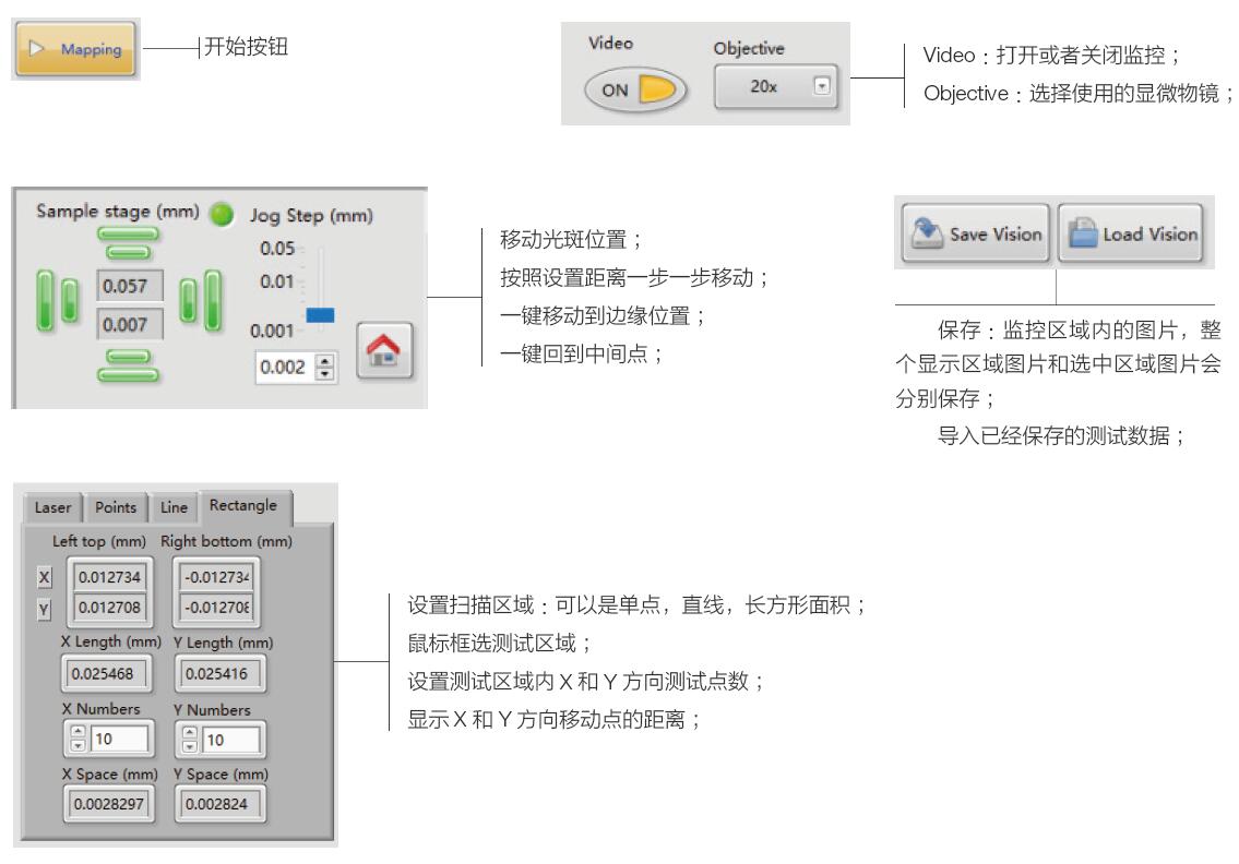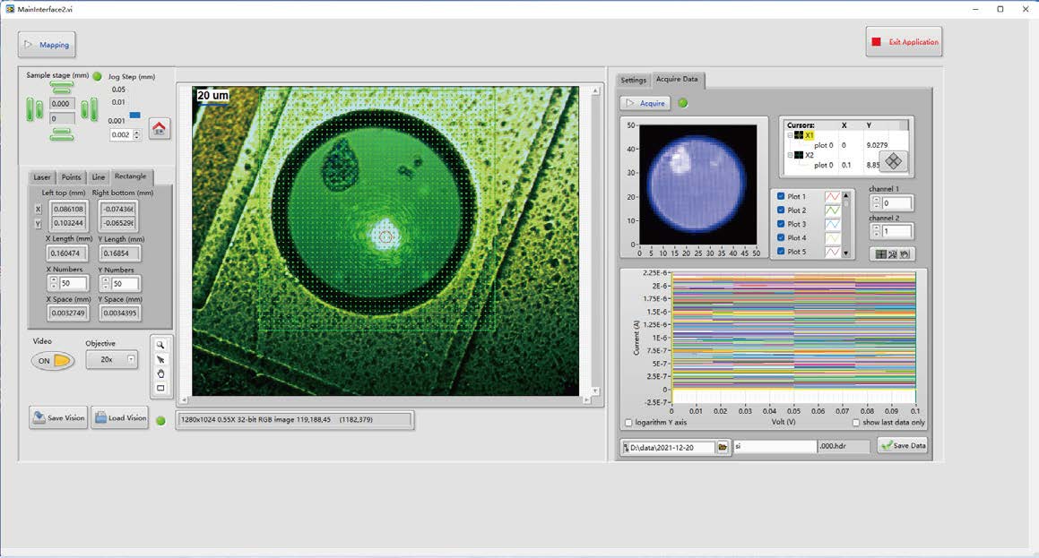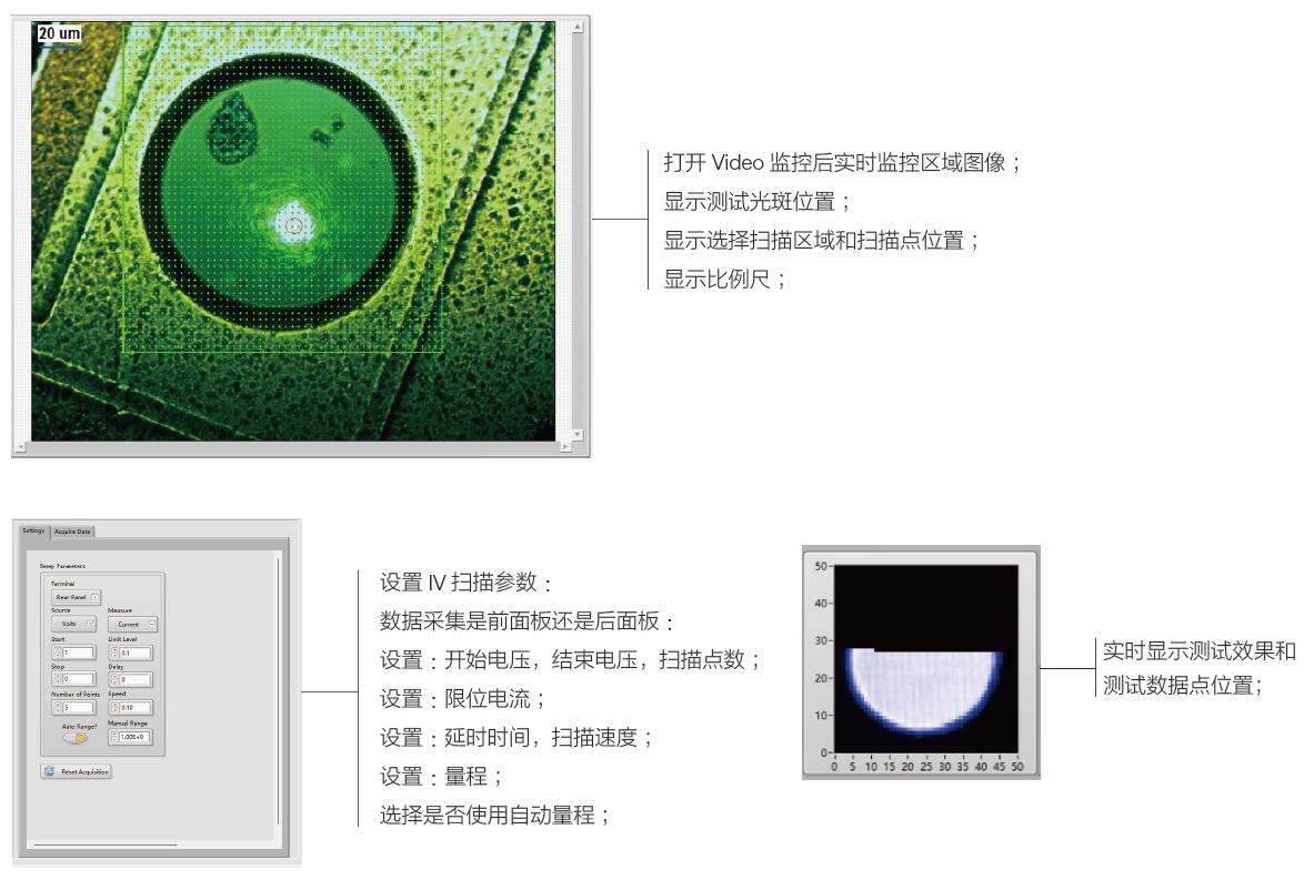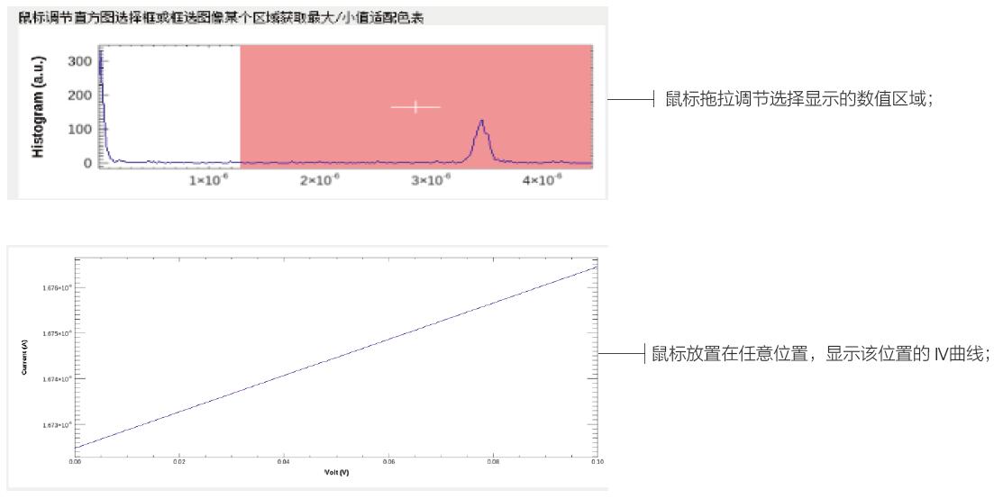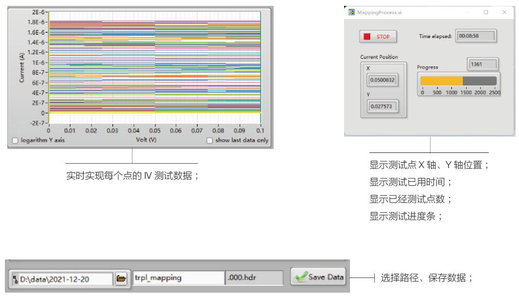 光電流掃描(Mapping):可以設(shè)定固定的電壓,逐點(diǎn)獲取電流值 I-V曲線掃描(Mapping):可以設(shè)定指定的電壓區(qū)間,逐點(diǎn)獲取I-V曲線 指定區(qū)域掃描(Mapping) |