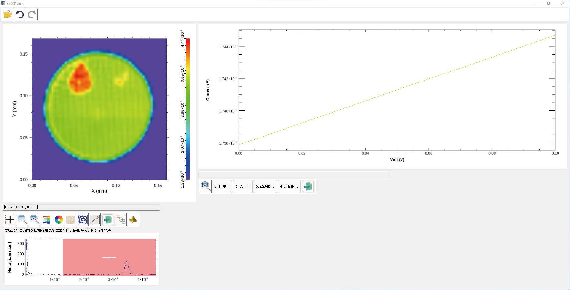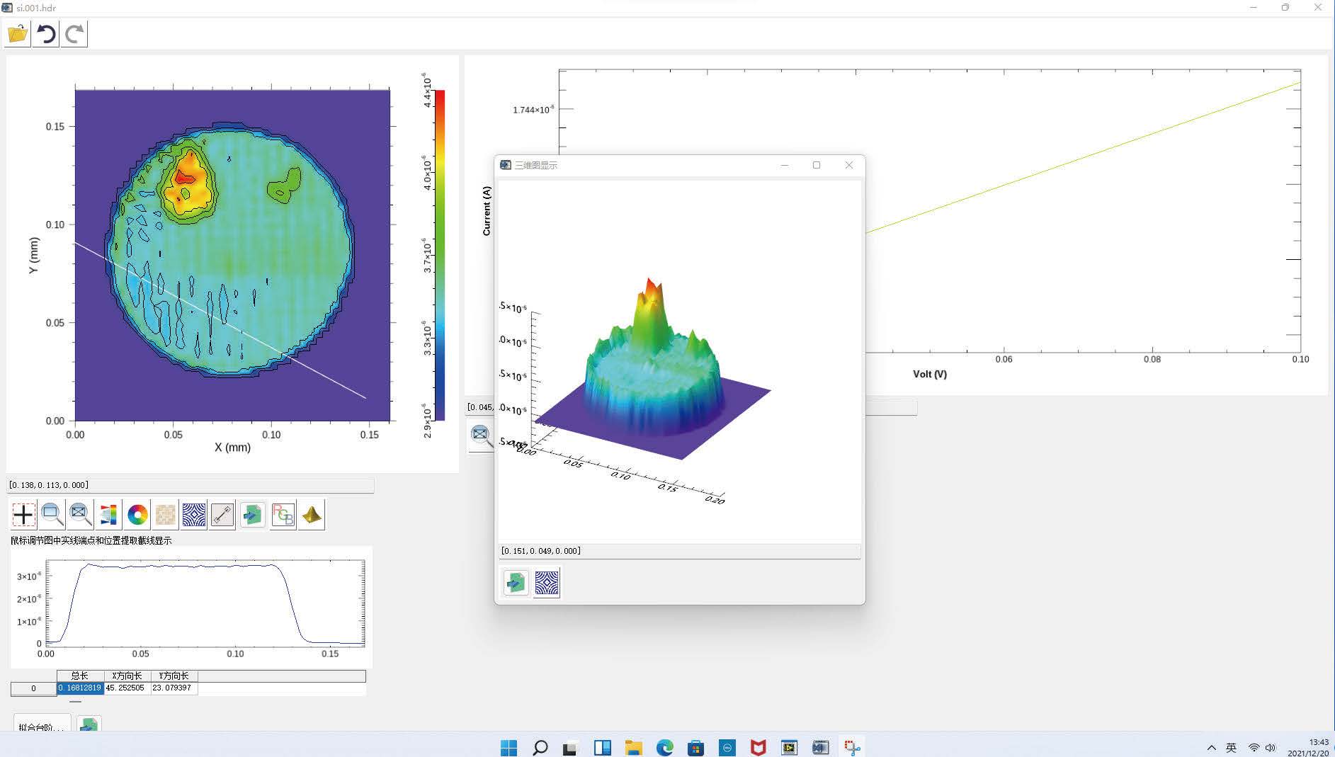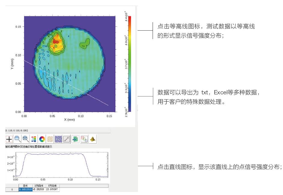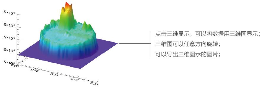 閾值處理;局部放大,等高線顯示,三維顯示,單點(diǎn)測(cè)試數(shù)據(jù)顯示,導(dǎo)出txt,excel 數(shù)據(jù)等。