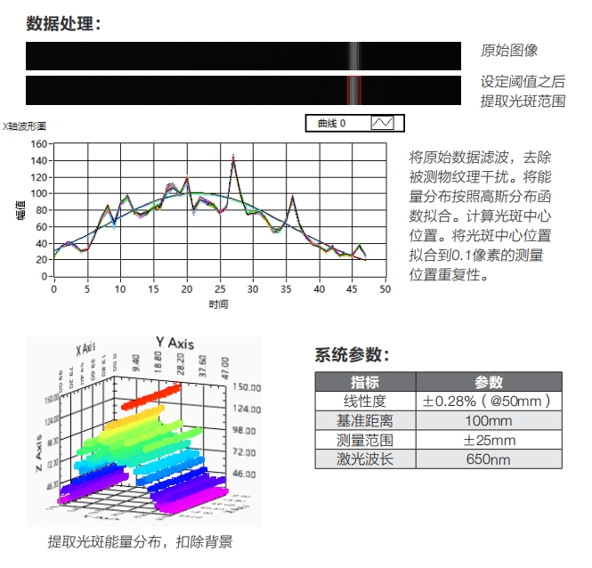 激光位移傳感器是被廣泛應(yīng)用的一種激光測距系統(tǒng)。原理是將發(fā)射點、目標(biāo) 點、接收點三者構(gòu)成一個空間三角形。通過已知的發(fā)射點和接收點兩者位置來算 出目標(biāo)點的位置。本系統(tǒng)是對激光三角法的有效驗證。在實驗條件狀態(tài)下,我們 是通過線陣相機(jī)記錄在全量程范圍內(nèi)的光點位置信息。可通過標(biāo)定數(shù)據(jù)的方式使 光點位置和測量距離形成映射,達(dá)到測量位移的目的??捎糜跍y距儀原理演示實 驗、光點位置信息讀取算法驗證、位置標(biāo)定算法驗證等場景。