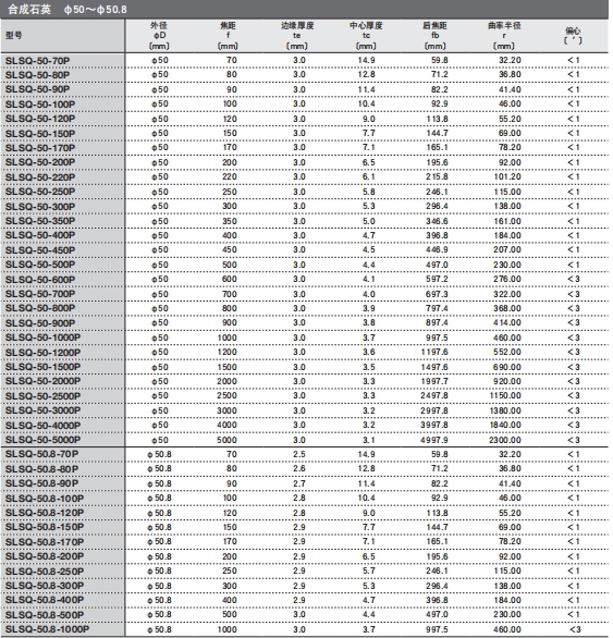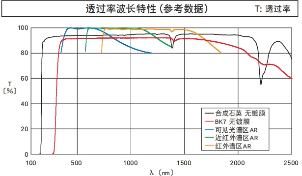 ?有從可見光到近紅外用的BK7材料的透鏡,和可用于350nm以下紫外光的高激光損傷閾值的合成石英透鏡,和適用于ArF(193nm)和KrF(248nm)的準(zhǔn)分子激光用合成石英透鏡,這三種類型。