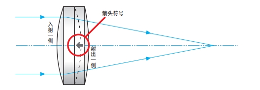 ?入射消色差透鏡的平行光有方向性,要從曲率半徑較小的一側(cè)(有箭頭符號指向的一面)射入平行光。從相反的一側(cè)射入平行光時,會產(chǎn)生色差或球差,焦點(diǎn)光斑會變大。