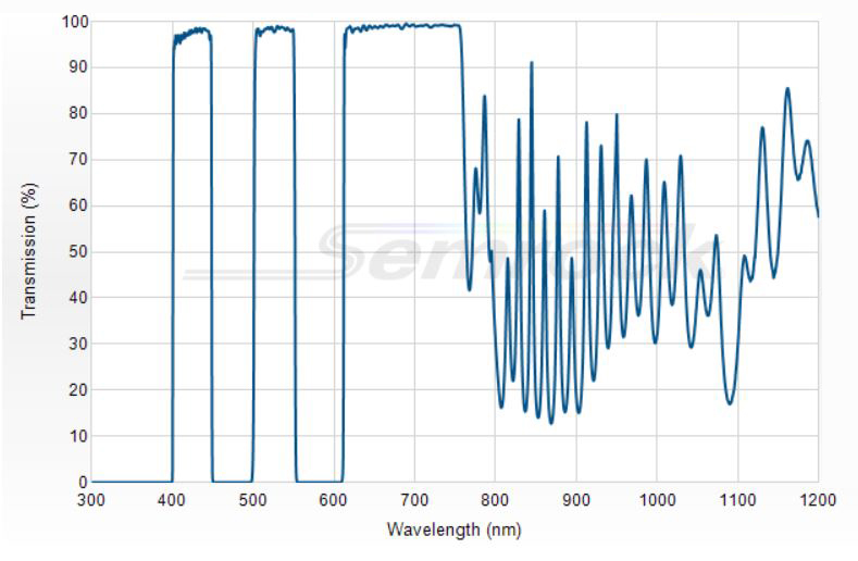如果想獲取某一波長(zhǎng)范圍的光( 比如說可見光范圍), 除了找到專用的濾光片以外,我們也可以用兩塊濾光片來實(shí)現(xiàn):一塊長(zhǎng)波通濾光片/ 短波截止濾光片( 如380nm 以上通過/380nm 以下截止) 和一塊短波通濾光片/ 長(zhǎng)波截止濾光片( 如780nm 以下通過/780nm 以上截止),可參考下圖: