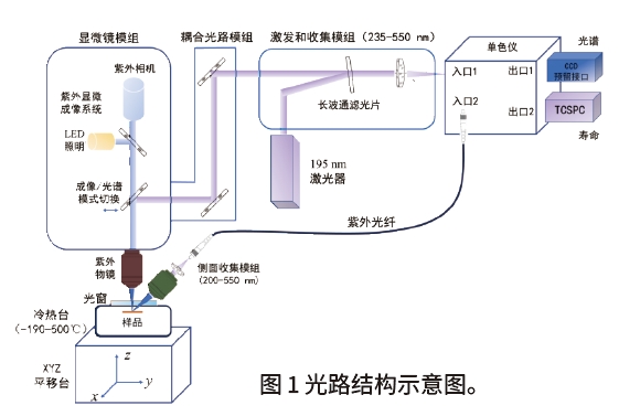 光學部分如圖 1所示,由適配冷熱臺的顯微鏡模組、耦合光路模組、激發(fā)和收集模組(190nm-550 nm)、單色儀和TCSPC系統(tǒng)和側面收集模組構成。