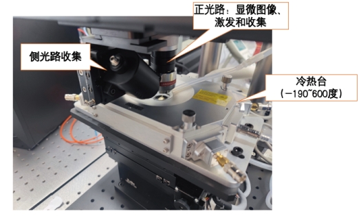 樣品位于可變溫-190~600℃(標配)與10K~300K(可選)冷熱臺中,可通過光窗進行光激發(fā)和收集。為了對樣品進行聚焦,將冷熱臺置于手動XYZ平移臺上,可在小范圍內對樣品進行選區(qū)和通過調節(jié)Z軸進行聚焦,具體的調節(jié)方式是:變溫臺實現XY方向調整,Z軸由物鏡升降實現。