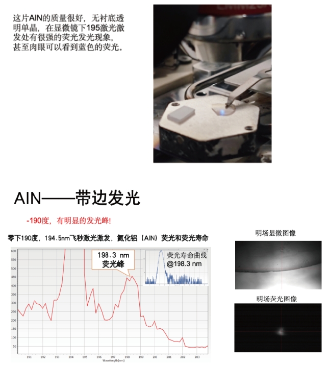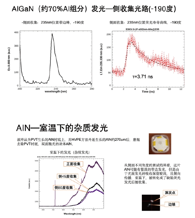 針對AlN的發(fā)光波段(200-210nm),沒有合適的濾光片濾除激光,且AlN由于輕重空穴帶反轉,其熒光發(fā)光角度為側面出光,因此設置側面收集模組,將側面發(fā)出的熒光(200-550nm)通過一個單獨傾斜60度角的物鏡收集后,通過光纖傳入單色儀入口2進行收集和測量。