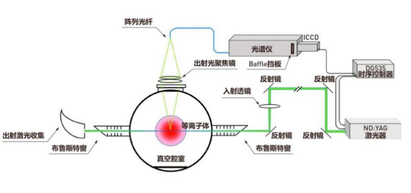 等離子體中心到透鏡的距離L和光纖的芯徑,及像斑決定了收集透鏡的焦距。舉例如下:如果像斑要求是fP =2mm,光纖芯徑400mm, 則物像比是4,如果L=320mm, 則透鏡的焦距就是320/4=80mm。同時如果觀測的等離子體范圍是50mm,那光纖一字排開的范圍就是50mm/4=12.5mm。這個寬度和連接譜儀一側(cè)的光纖束的尺寸很接近了,連接收集透鏡一側(cè)光纖也應(yīng)該是密集排布,這樣兩端容納的光纖數(shù)量就是匹配的。