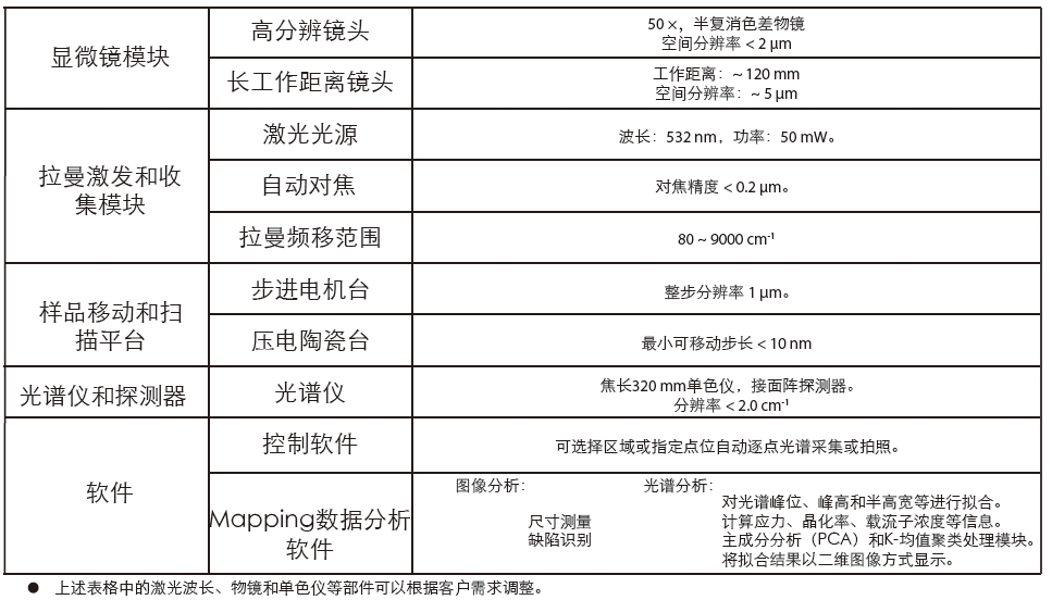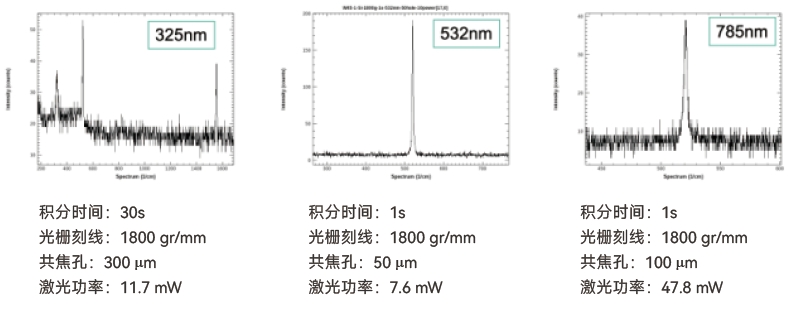 2.光激發(fā)與拉曼光譜收集:激光器通過光線分束器耦合進(jìn)一根光纖跳線中,激光從光纖端面照射到顯微鏡中的分光鏡并通過鏡頭聚焦到樣品的表面,再通過鏡頭收集熒光或拉曼信號回到光纖中,并傳輸?shù)絾紊珒x和光譜CCD中采集拉曼光譜。這種通過鏡頭以共焦方式施加激發(fā)光的方案優(yōu)勢在于:1、通過鏡頭的聚焦,可以更加準(zhǔn)確地控制光斑的大小和位置;2、所有對于激發(fā)光的調(diào)節(jié)機(jī)構(gòu)全部在大氣中,方便調(diào)節(jié),省去了真空中的光纖探針和相應(yīng)的位置調(diào)節(jié)機(jī)構(gòu)。通過這種方式引入單色激發(fā)光的效果詳見第2.3節(jié)