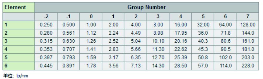 該套光學(xué)配置的理論分辨率為0.005mm,通過THORLABS的USAF1951標(biāo)準(zhǔn)分辨率板測試,如上圖中的右圖所示,能最小分辨的線對編號為右圖虛線框中的“6-3”對照如下1951 USAF測試靶的表格