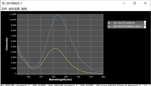 右圖黃線為被測樣品熒光原始數(shù)據(jù),藍線為被測樣品校正后的數(shù)據(jù)。將兩個光譜做對比,發(fā)現(xiàn)校正后的光譜峰值紅移的10nm,也就是說, 未經(jīng)校正的原始數(shù)據(jù)將真實的光譜藍移了10nm。