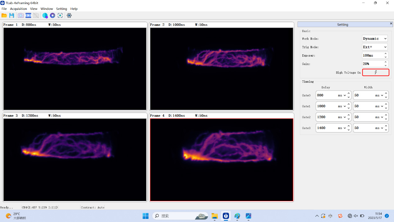 延遲800ns-1.4us放電,間隔200ns, 門寬50ns, 清晰可見放電區(qū)域逐步膨脹過程。