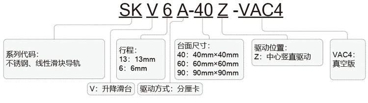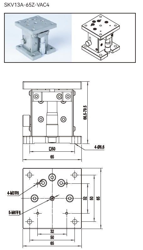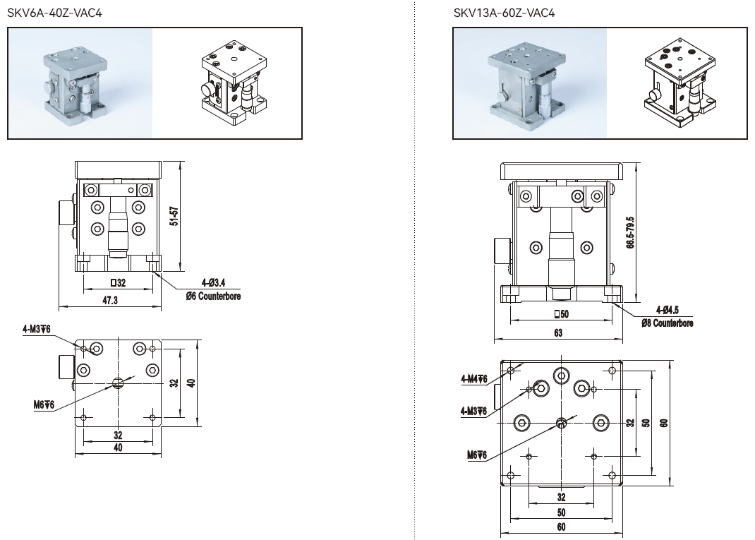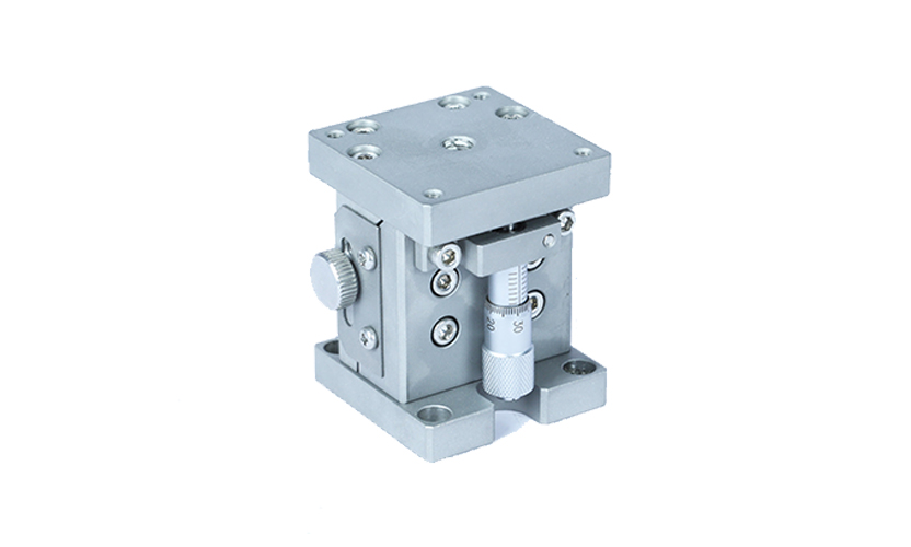 SKV 系列是采用直頂式結(jié)構(gòu)的高精密手動升降滑臺。該系列產(chǎn)品采 用分厘卡驅(qū)動,使用直線滑塊導(dǎo)軌導(dǎo)向,保證臺面升降時具有很好的運動 精度。臺面多種標(biāo)準(zhǔn)孔位的安裝孔適合不同需要, 下方標(biāo)準(zhǔn)固定孔方便將 其與其他滑臺連接,組成多維移動臺。
