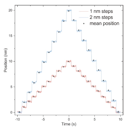 圖2:以 1 nm 和 2 nm 步 長 分 別 進 行 的 10 步 往 復測量。測量在距反射器 150 mm 處進行,光學傳 感器頭精確對準反射器中心。測量帶寬為 50 Hz, 每一步的平均位置數據點均通過對該步內所有單 獨數據點(共 1000 個)取平均值計算得到。
