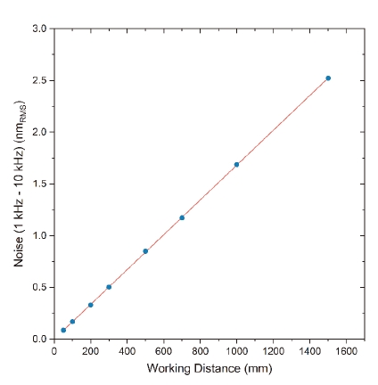 圖 1:不同工作距離下,在頻率范圍(1 kHz 至 10 kHz)內的均方根(RMS)噪聲。噪聲隨工作 距離線性增加,歸因于激光相位噪聲的貢獻。