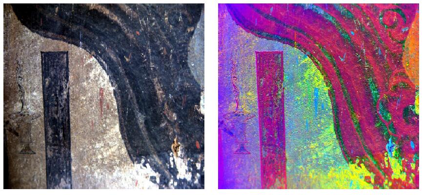 In order to objectively distinguish the variation of the internal components of the mural and the recognition of the mural handwriting, Principal Component Analysis (PCA) is performed on the pre-processed hyperspectral data to remove the redundant information between bands and compress the multi-band image information into a few converted bands that are more effective than the original bands. In general, the first principal component contains 80% of the variance information in the bands, and the first three principal components contain more than 95% of the information in all bands. Due to the uncorrelatedness among the bands, the foremost component bands can generate more colorful and better saturated color composite images. Fig.4 Compare and analyze the composite images of mural hyperspectral images before and after PCA changes, respectively.