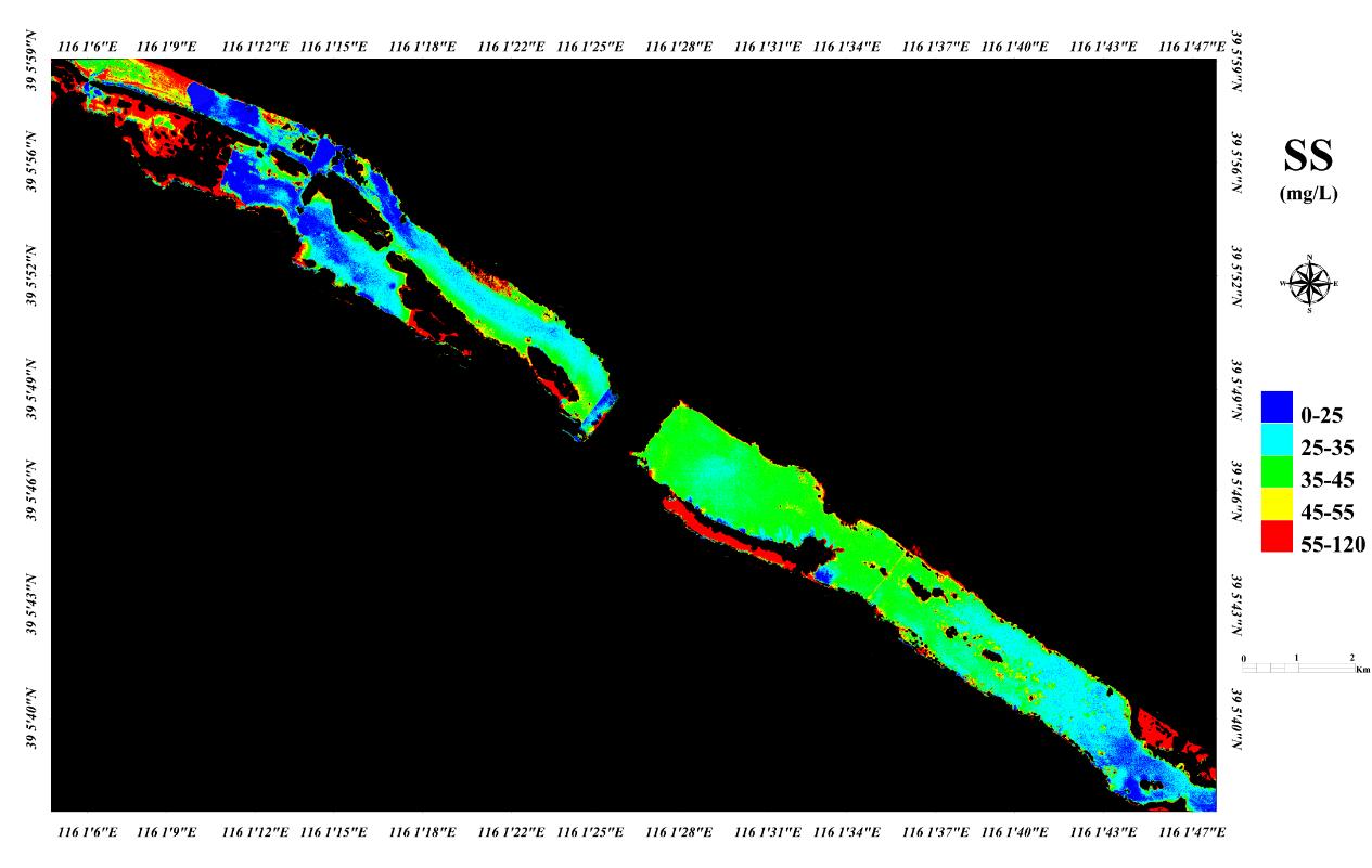 Taking the Daqing River as an example, the airborne hyperspectral image is used to invert the distribution of suspended matter concentration in the water quality of the Daqing River, as shown in Figure 8.