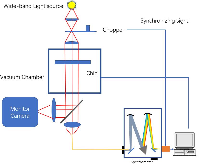 Similar to the reflection way, the chopper also modulates the probe light to pulsed light, which is converted into parallel light by the lens group, and the transmission spectrum is obtained after passing through the sample. The probe light is introduced into the spectrometer by optical fiber for analysis. At the other end of the optical path, through the imaging system, the interior of the vacuum chamber can be monitored with a Monitor camera.