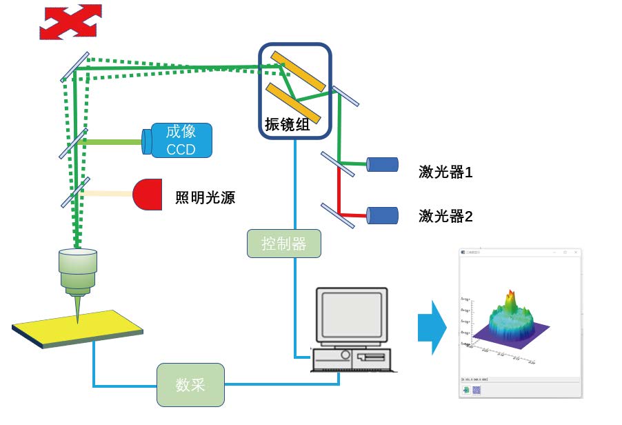 The system contains excitation lasers, scanning galvanometer, microscopy, data acquisition unit, and control software. When scanning the sample, the galvanometer make the laser spot scans and moves in the XY direction of the sample fast. The software records the position of each scanning point and current output value, and synchronously depicts a graph showing the current distribution of the sample. The light path also ensure the light spot pattern on different positions of the sample will not change.