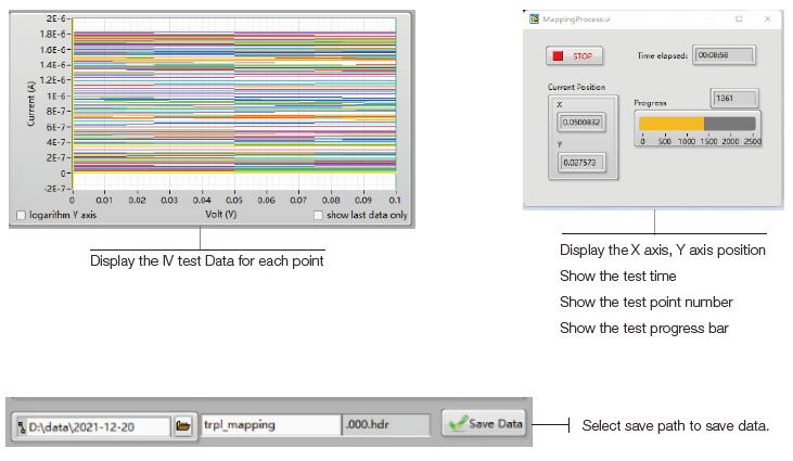 Photocurrent scanning: Set a fixed voltage, record the current of different point. I-V curve scanning: Set a voltage range to acquire I-V curve of different point The scanning area can be selected. |