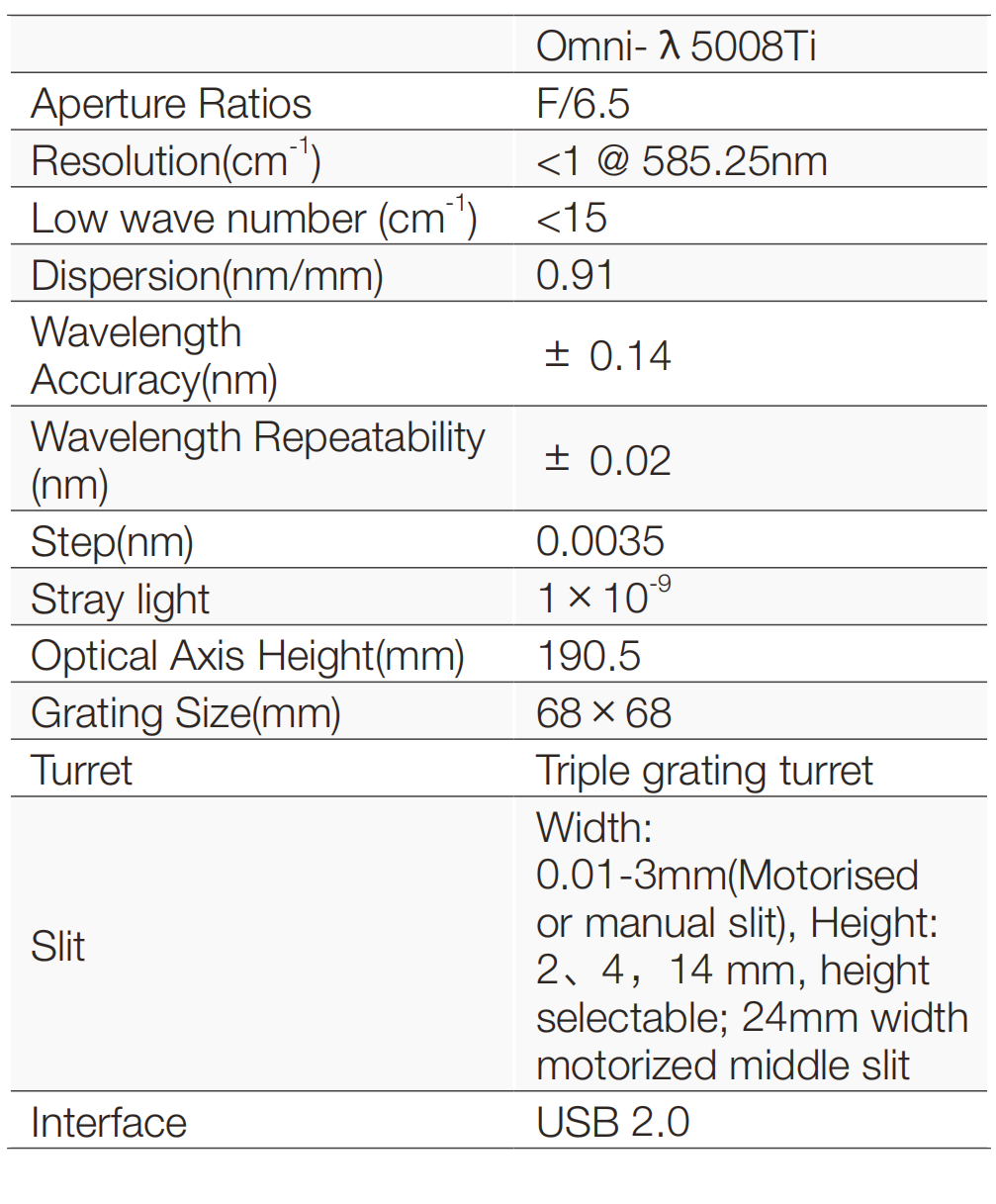 The triple monochromator is consisted of three image calibration monochromators by fine adjustments. The first two monochromators connected in subtractive dispersion mode to reduce stray light; the last two monochromators connected in additive dispersion mode to improve the resolution. The triple spectrometer is flexible for use in single, double and triple monochromator operation. Thanks to its tunable wavelength and adjustable notch, the triple spectrometer is mainly used for high-end Raman spectrum measurements, such as ultraviolet excitation Raman spectrum and low wavenumber Raman spectrum.