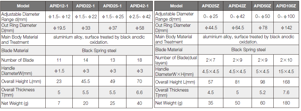 APID series adjustable diaphragms are similar in structure to the diaphragm behind the camera lens and are also made up of multiple arcs.