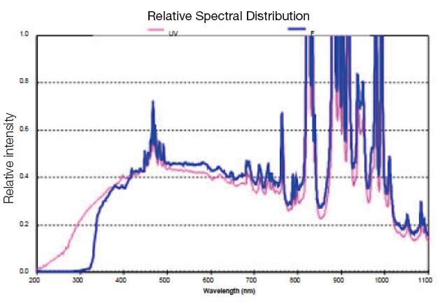 Sirius-300P series photocatalysis light source has high output from UV to NIR, Sirius-300P-F focus on simulated sunlight of visible light; Sirius-300P-UV has strong continuous output within 200-400nm and focus on applications of high UV requirements. Spectral curve as right picture:
