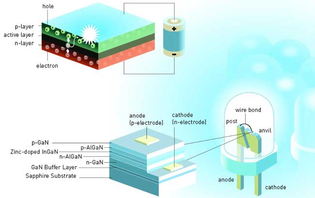 GaN LED 芯片的發(fā)光原理及結(jié)構(gòu)示意圖