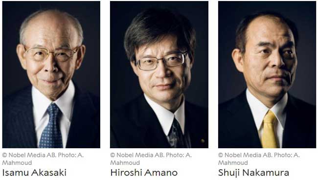 2014 年10 月7 日,赤崎勇、天野浩和中村修二(名字從左到右分別對(duì)應(yīng))因發(fā)明“高效藍(lán)色發(fā)光二極管”而獲得2014 年諾貝爾物理學(xué)獎(jiǎng)。