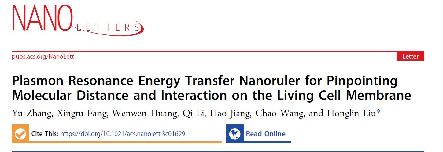 首先為大家?guī)韯⒔淌趫F隊有關(guān)細胞膜表面納米尺相關(guān)研究工作,該研究成果以“Plasmon Resonance Energy Transfer Nanoruler for Pinpointing Molecular Distance and Interaction on the Living Cell Membrane”為題發(fā)表在Nano letters 期刊中(doi.org/10.1021/acs.nanolett.3c01629)。
