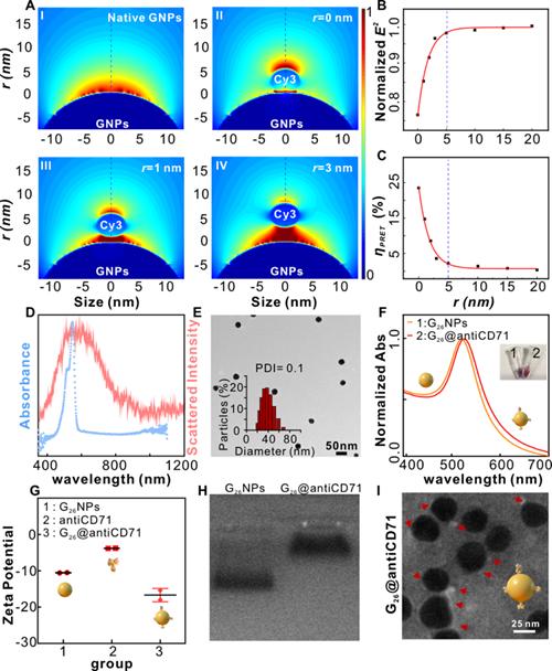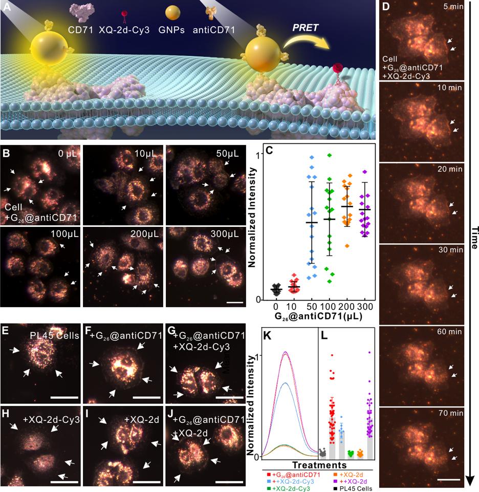近日,課題組報道了單個納米金顆粒和單個分子偶極之間的PRET現(xiàn)象。研究團隊使用兩種無競爭性結(jié)合的配體,即適體XQ-2d-Cy3和抗體antiCD71,識別活細胞膜上同一受體蛋白CD71的不同位點;適體攜帶小分子熒光標(biāo)簽作為能量受體,抗體攜帶單粒徑的金顆粒作為供體,觀察到了能量供體與受體之間無任何“系繩”連接的PRET現(xiàn)象。基于此原理,構(gòu)筑了靈活的PRET光學(xué)納米尺,實現(xiàn)了活細胞表面分子距離和蛋白互作的觀察與測量。有限元理論模擬和暗場成像實驗結(jié)果一致表明,該PRET納米尺在活細胞膜表面測量位點分離距離和蛋白互作具有可行性和穩(wěn)定性,在分析科學(xué)納米尺度測量領(lǐng)域具有廣泛的應(yīng)用前景。
