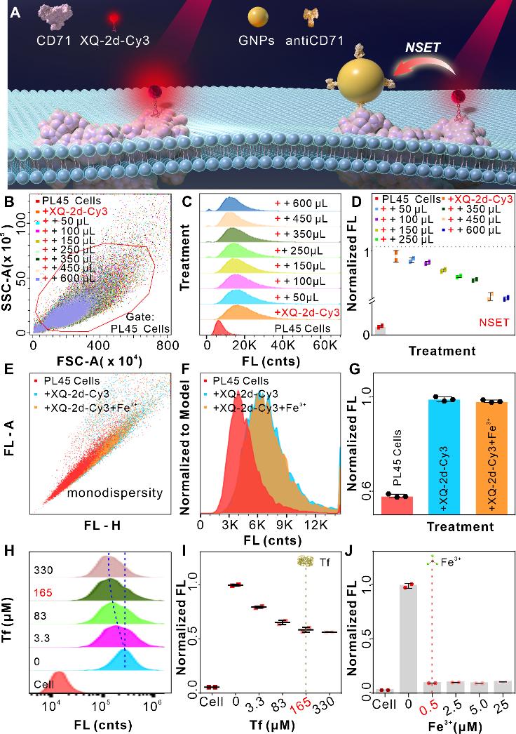 此外,研究團隊還利用流式細胞術(shù)在活細胞膜表面觀察了同一系統(tǒng)中 與PRET相反的能量轉(zhuǎn)移過程——NSET現(xiàn)象。即單獨激發(fā)熒光標(biāo)簽(XQ-2d-Cy3)時,可以反向觀察到XQ-2d-Cy3到金顆粒表面的能量轉(zhuǎn)移過程。
