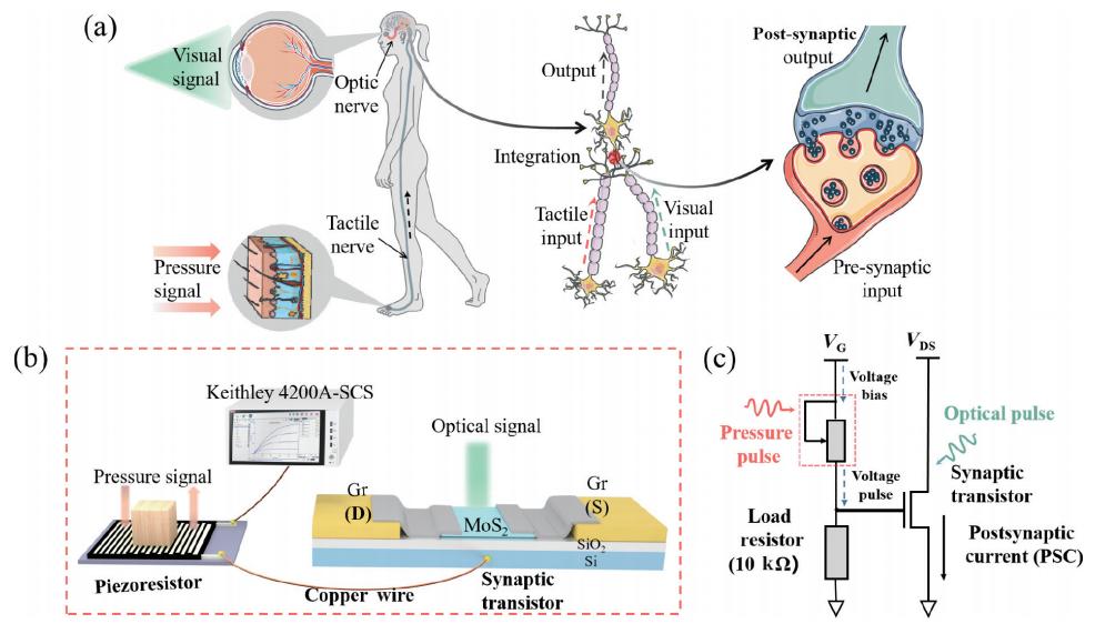 生物感官知覺能夠檢測(cè)外部環(huán)境信息,包括視覺、觸覺、聽覺、味覺和嗅覺。這些信息通過神經(jīng)網(wǎng)絡(luò)中突觸連接的強(qiáng)度實(shí)時(shí)集成、記憶和處理,以調(diào)節(jié)內(nèi)部狀態(tài),對(duì)維持人類正常行為至關(guān)重要。人工仿生電子學(xué)具有在人工智能芯片中應(yīng)用的潛力,已經(jīng)開發(fā)出模仿人類感官的系統(tǒng),如電子眼睛、鼻子、舌頭和喉嚨。然而,這些設(shè)備無法模擬人類對(duì)真實(shí)世界外部環(huán)境的反應(yīng),因?yàn)橥ǔ5男袨樾枰喔泄賲f(xié)同。因此,模擬行走時(shí)視覺和觸覺感覺的協(xié)同作用對(duì)于開發(fā)更真實(shí)和高效的類人機(jī)器至關(guān)重要。