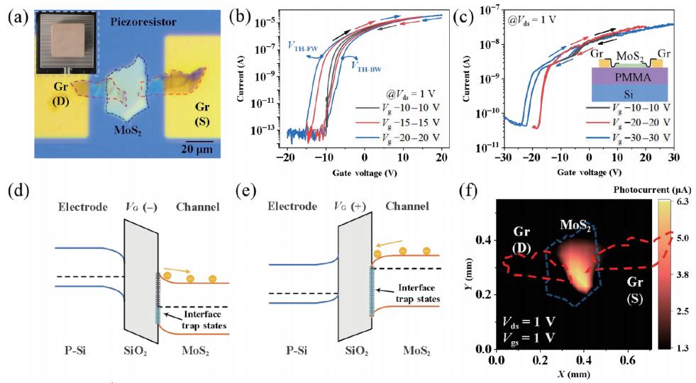 圖2 MoS2 FET的滯后性和光學(xué)響應(yīng)特性。(a) Gr-MoS2-Gr FET的光學(xué)顯微鏡圖像。插圖:一個(gè)木塊的光學(xué)圖像和一個(gè)壓電電阻器。轉(zhuǎn)移特性在不同背柵電壓掃描范圍下的滯后性在(b)二氧化硅和(c)PMMA襯底上。插圖:(c) PMMA襯底上MoS2晶體管的能量帶示意圖。在(d)負(fù)門極電壓偏置和(e)正門極電壓偏置時(shí)的能帶圖。(f) MoS2 FET在源極-漏極偏置為+1 V時(shí)的光電流映射。激光束(λ=532 nm,P=0.25 mW)通過物鏡聚焦到大約5 μm的斑點(diǎn)大小。