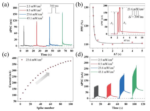 圖3基于MoS2場(chǎng)效應(yīng)晶體管的光學(xué)(532nm)信號(hào)觸發(fā)的突觸特性。柵極和漏極電壓偏置分別為0和1V。(a)設(shè)備由不同功率強(qiáng)度的單個(gè)光脈沖觸發(fā)時(shí),ΔPSCs(Δ表示變化,PSCs表示突觸后電流)的變化。(b)設(shè)備的PPF-ΔT擬合曲線。插圖顯示了由兩個(gè)連續(xù)的光尖峰觸發(fā)的PPF響應(yīng)(強(qiáng)度為23.6mW/cm²),其ΔT為300ms。(c)MoS2 FET的EPSC隨尖峰數(shù)量的變化。(d)設(shè)備在不同的光學(xué)強(qiáng)度下以1Hz的頻率被10個(gè)脈沖觸發(fā)時(shí)的ΔPSCs。
