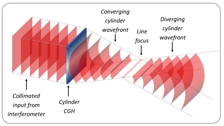 圓柱形 CGH 是一種衍射光學(xué)元件,可以將準(zhǔn)直干涉儀波前轉(zhuǎn)換為會聚圓柱形波前。凹凸圓柱形光學(xué)元件可以用相同的 CGH 在共焦零點(diǎn)測試中進(jìn)行測量。凸面圓柱形光學(xué)元件位于會聚波前,凹面圓柱形光學(xué)元件則位于發(fā)散波前。