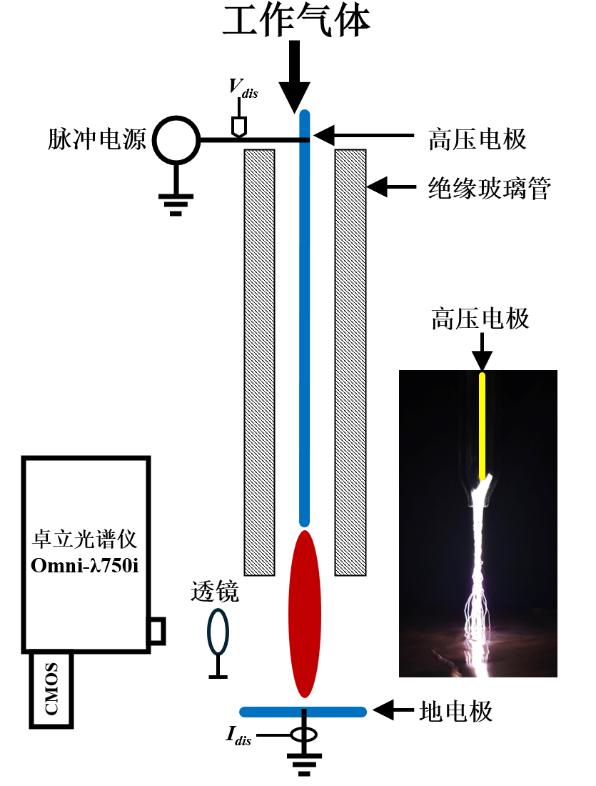 大氣壓低溫等離子體射流實(shí)驗(yàn)裝置由高壓脈沖電源、等離子體射流發(fā)生器、卓立發(fā)射光譜測量系統(tǒng)、電參數(shù)測量系統(tǒng)和供氣系統(tǒng)構(gòu)成,如圖1所示。高壓電極放置在單端封口的石英玻璃管中,其底端距離地電極20mm。高壓脈沖電壓峰值14kV,頻率2kHz,脈寬500ns。工作氣體為氬氣,流速2.5L/min。卓立發(fā)射光譜測量系統(tǒng)由卓立Omni-λ750i光譜儀與科學(xué)級(jí)像增強(qiáng)型相機(jī)IsCMOS構(gòu)成,IsCMOS相機(jī)也可單獨(dú)連接鏡頭做像增強(qiáng)高速相機(jī)使用,如圖2所示。