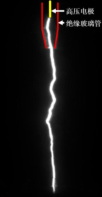 利用IsCMOS拍攝的單個(gè)脈沖放電照片如圖3所示。設(shè)置相機(jī)曝光時(shí)間為500ms,關(guān)閉IOC,單次觸發(fā)采集。利用信號(hào)發(fā)生器外觸發(fā)相機(jī),頻率2kHz,與高壓脈沖電源同步。門延時(shí)(delay)設(shè)置180ns,門寬(width)設(shè)置550ns。由圖3可以發(fā)現(xiàn),氬氣射流放電在一個(gè)電壓周期中呈現(xiàn)絲狀,類似電弧的放電通道。