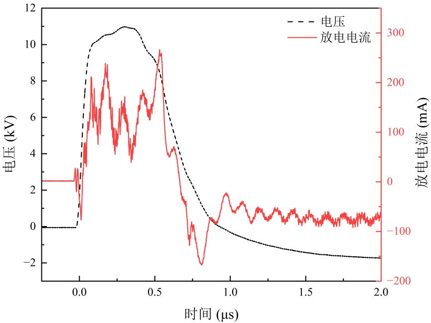 同時(shí),實(shí)驗(yàn)過程中采集了Ar等離子體射流放電電壓電流波形,如圖4所示。其中,放電電流為總電流減去位移電流。從圖中可以發(fā)現(xiàn)Ar等離子體射流在一個(gè)脈沖周期內(nèi)存在兩次放電,分別發(fā)生在上升沿和下降沿,且上升沿的放電持續(xù)時(shí)間較長。