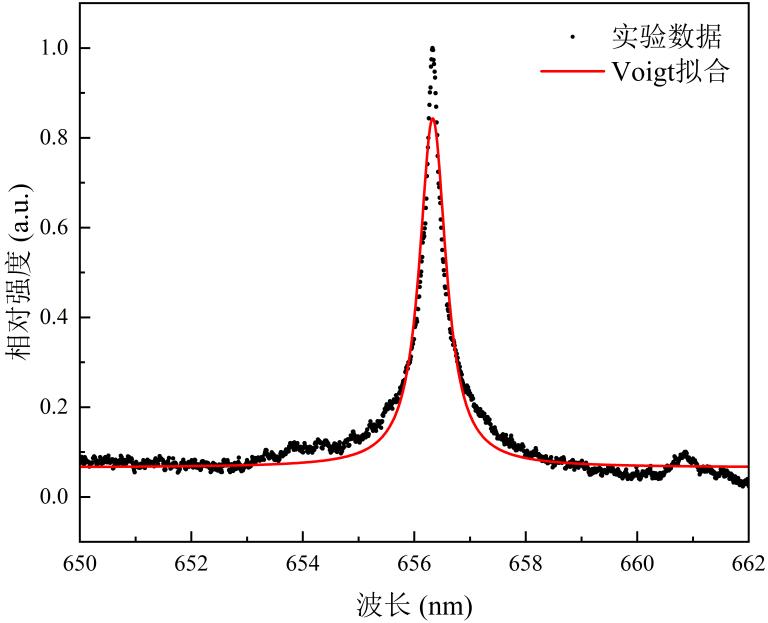 圖8給出了Ar等離子體射流在650nm-662nm范圍內(nèi)的Hα譜線,以及進(jìn)行Voigt擬合的結(jié)果,可以得出洛倫茲展寬ΔλL=0.5500nm。減去范德瓦爾斯展寬ΔλW=0.0353nm,得到斯塔克展寬ΔλS=0.5147nm。根據(jù)式(5)計(jì)算得到,實(shí)驗(yàn)中使用的Ar等離子體射流的電子密度約為3.28×1016 cm-3。