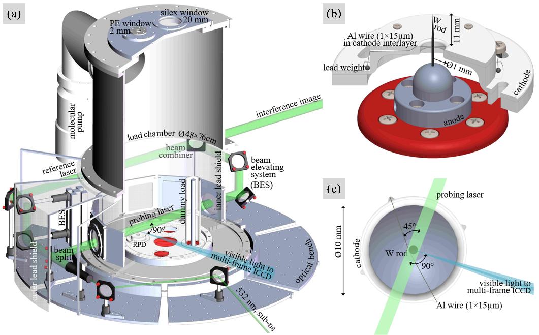 研究團(tuán)隊(duì)在西安交通大學(xué)漢-1脈沖功率裝置上進(jìn)行了實(shí)驗(yàn),采用多種診斷手段對(duì)WS-RPD的等離子體動(dòng)力學(xué)行為進(jìn)行了深入分析。其中包括:激光干涉測(cè)量,用于觀察等離子體電子密度分布;四分幅ICCD成像,捕捉等離子體可見光;電參數(shù)測(cè)量,包括Rogowski線圈測(cè)量電流及D-dot探頭測(cè)量電壓;X射線測(cè)量,采用PIN二極管探測(cè)X射線的輻射劑量率。