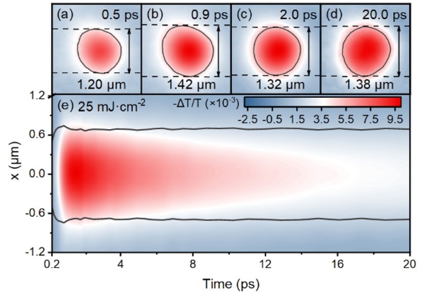 圖1. 激發(fā)光選用515nm聚焦光束(激發(fā)功率密度為25mJ/cm2),以700nm探測(cè)光(帶寬40nm)進(jìn)行成像, 探測(cè)時(shí)間為(a)0.5ps,(b)0.9ps,(c) 2.0ps,(d)20.0ps的二維TAM光譜,在不同的延遲時(shí)間下標(biāo)記出半高寬。(e)激發(fā)功率密度為25mJ/cm2時(shí)載流子密度分布圖。[1]