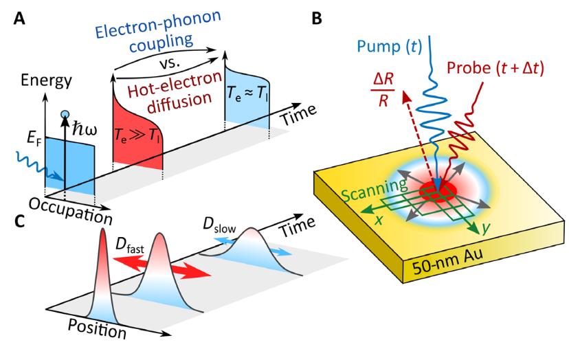 圖2. 掃描超快熱調(diào)節(jié)顯微鏡的原理圖。(A)在環(huán)境溫度下, 導(dǎo)帶電子的能量分布受到光激發(fā)的擾動(dòng)。它迅速演變?yōu)榫哂懈唠娮訙囟龋═e)的準(zhǔn)熱化“熱電子”,符合費(fèi)米-狄拉克分布。而晶格溫度(Tl)保持接近環(huán)境水平。由于電子-聲子耦合和熱載流子擴(kuò)散的后續(xù)冷卻導(dǎo)致電子和晶格子系統(tǒng)之間的熱交換和熱平衡。(B)激光脈沖照射50nm的金薄膜,從而引起局部熱電子分布。探測(cè)光脈沖測(cè)量溫度相關(guān)的瞬態(tài)反射率(DR/R)。(C)探測(cè)光監(jiān)測(cè)光致DR/R光斑尺寸的時(shí)空演變,以可視化和區(qū)分熱電子擴(kuò)散和熱(聲子限制)擴(kuò)散。[2]