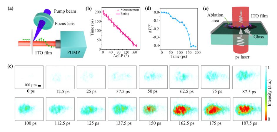 圖.飛秒激光燒蝕ITO薄膜的超快成像: (a)實(shí)驗(yàn)設(shè)計(jì),(b)200 ps照明激光脈沖時(shí)偏振映射關(guān)系。(c) ITO膜燒蝕的時(shí)空演變,(d)燒蝕區(qū)透射率差ΔT/T,(e)飛秒激光燒蝕ITO薄膜的機(jī)理.[3]